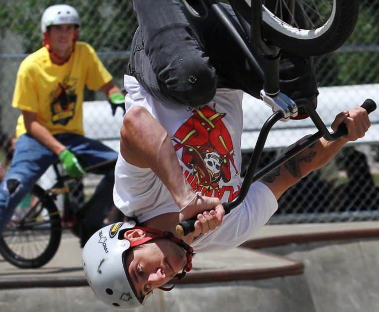 Reggie Runion of Alton, Ill., sails head over heals nailing a back flip, while making a run in the Advanced BMX competition during the Shredfest held Saturday, July, 27, 2013 at the Ramp Park in Huckeberry Park in Hannibal. H-W Photo/Steve Bohnstedt)