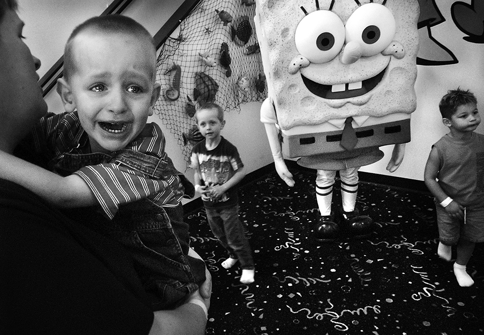 Held by his mom, Connie Wienhoff, Jake Wienhoff, 3, of Hannibal, Mo., asks for his daddy, J.R. Wienhoff, after the idea of meeting Sponge Bob Square Pants up close and in person proved a little too overwhelming for the toddler. The Wienhoff’s were among dozens of other families who turned out for the Sponge Bob Square Pants Fest at Going Bonkers in Quincy, I.L., Saturday.